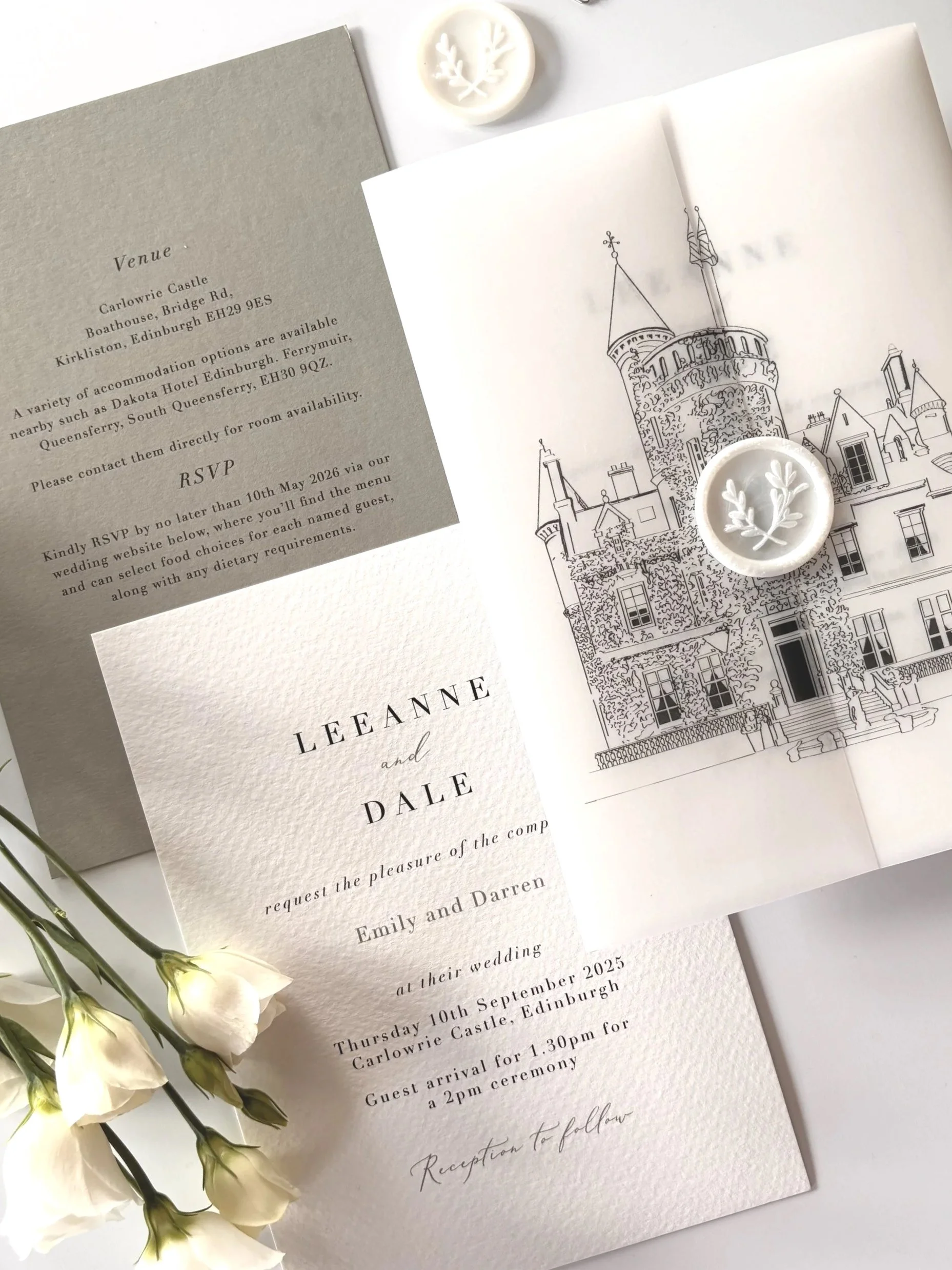 Based in Dundee, I work with couples across Scotland and throughout the UK, designing everything from save the dates and bespoke wedding invitations to on-the-day stationery like menus, signage and place cards.